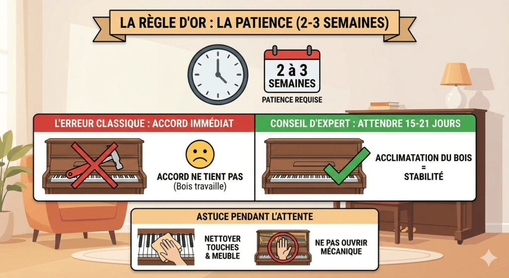 Notre conseil d’expert : Attendez au moins 15 jours, idéalement 3 semaines après la livraison avant de faire intervenir un accordeur. Ce délai permet à la table d’harmonie de se stabiliser (on parle d’acclimatation).