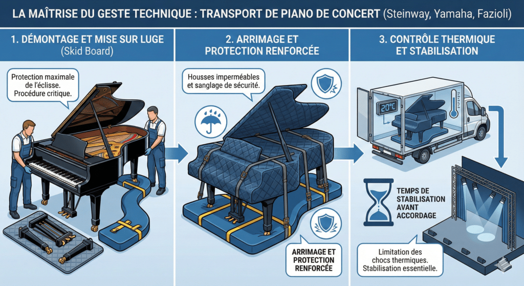 Un piano de concert ne se transporte pas comme un piano droit. C’est une mécanique de précision qui voyage « sur la tranche ».