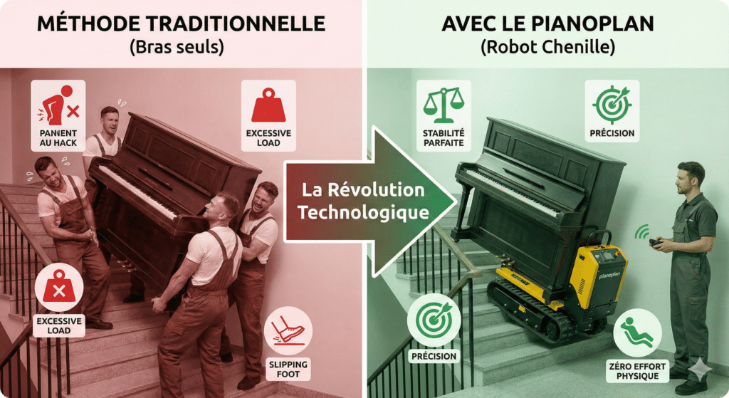 Contrairement à un diable classique ou à des sangles de portage, le robot supporte 100% de la charge. Nos déménageurs ne « portent » plus le piano : ils le guident.